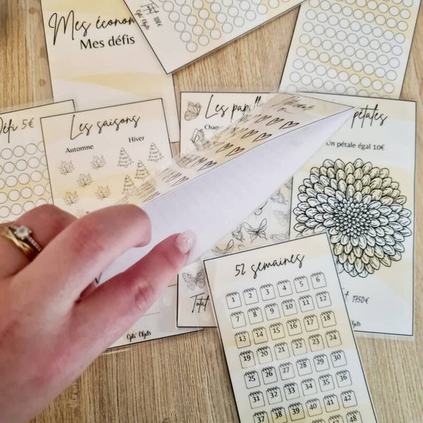 Il comprends 8 défis : 1€, 2€, 5€, les saisons, les papillons, les pétales, 52 semaines et un défi cœur.